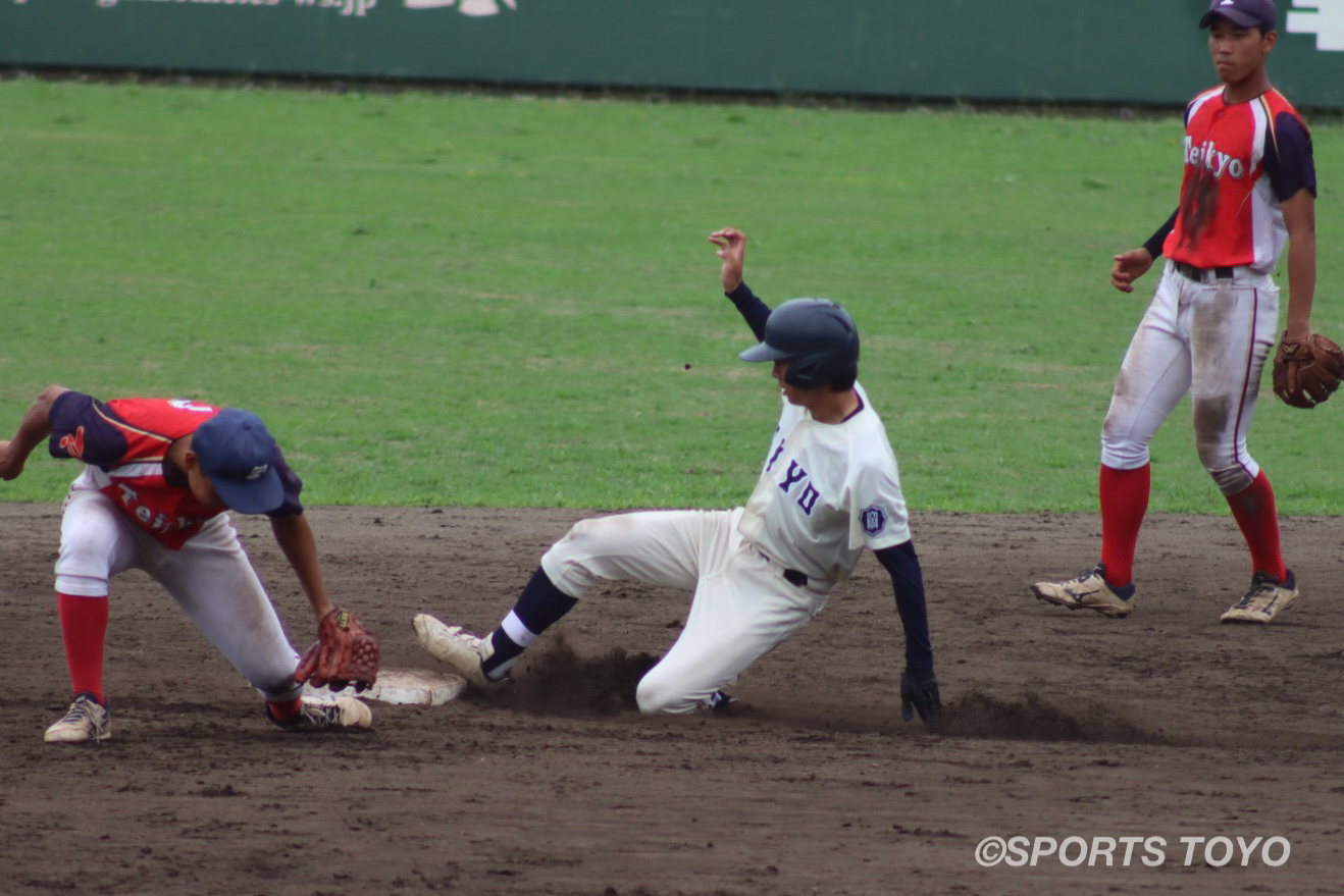 九回表、窮地に立つ東洋大は、1死で定直の打席。豪快なスイングで中堅手安打を放ち、帝京大は廣田が登板。しかし、続く打者はこの試合の期待のキーマン永井(経3=広陵)。代走鈴木(健1=宇都宮北)は、冷静な判断で盗塁を決め、1死二塁。永井の期待通りの中堅手安打で1点を返し同点に追いつき、ベンチからはガッツポーズと大きな声援が響き渡る。