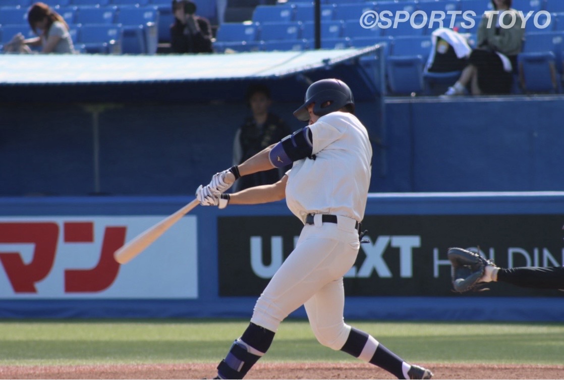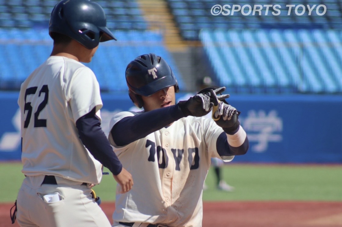 東洋大の先発は大坪(総3=智弁学園)。初回、先頭を死球で歩かせると犠打で、1死二塁。続く打者に三ゴロを打たせ、内野の好プレーで併殺に成功。笑顔でピンチを切り抜けた。すると二回表、井上監督の作戦がはまり、山城(亜大)は左打者に投げづらさを感じたのか、先頭の山内(総2=東海大相模)を四球で歩かせ、続く打者冨安(経3=履正社)の投犠打を失策。さらに宮下(総4=北海)が犠打をしっかりと決めると、打席は髙中(総2=聖光学院)へ。初球を迷いなく振り抜き、2点適時安打を放った。打撃に苦しんでいた髙中は一塁上で感情を爆発させるように吠えた。