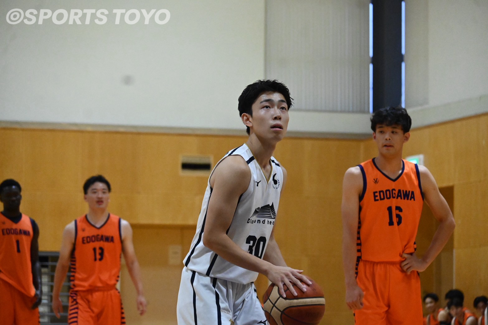 東洋大は 桑原利典(済3=北越)がバスケットカウントを取り、佐藤晴(スポ2=仙台大明成)の3ポイントやシュートで得点を重ねるも、江戸川大の粘り強いオフェンスにリードを許す。