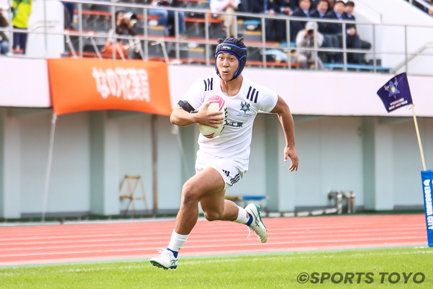 再開後も敵陣でのプレーを展開し、何度か好機が訪れるが、東海大の堅固なディフェンスに阻まれてしまう。すると30分、東海大がターンオーバーでボールを奪い、自陣へ。さらに広範囲でのパスワークにより東洋大のディフェンスに隙が生まれたところを、ライン際にいたWTB鬼頭慶(1年)に突破され、トライを許す。
