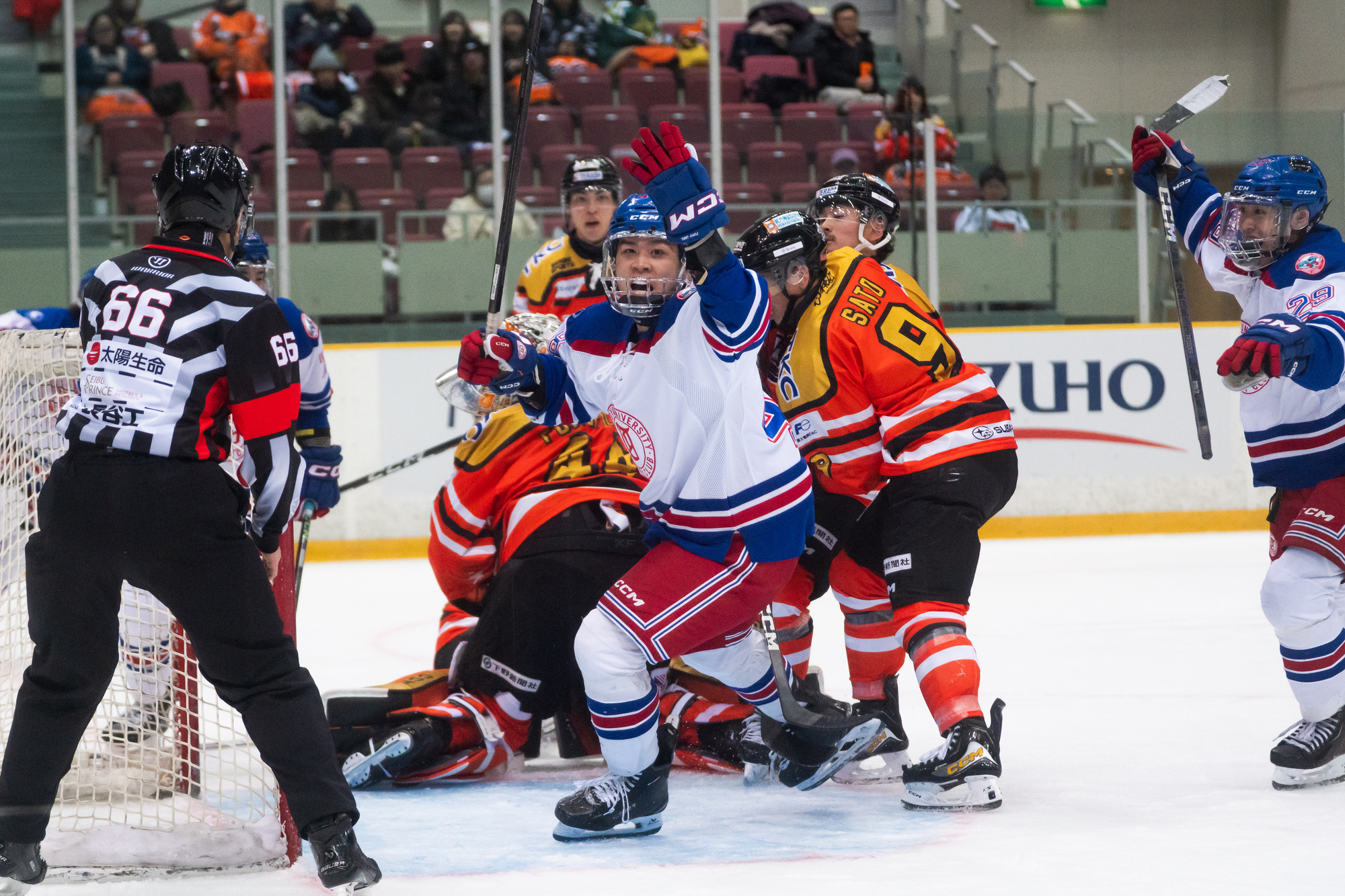 二日目は後輩も合流し、東洋大学と日光アイスバックスの試合を取材しました。東洋が1点決めた瞬間には思わず「おお!」と声が出てしまうほど盛り上がり、リンクサイドでもテンションが上がっていました。そんな中、相手チームのゴーリーがとんでもなくイケメンで、「うわ、かっこいいな」と別の意味でも盛り上がっていたのも今となってはいい思い出です笑